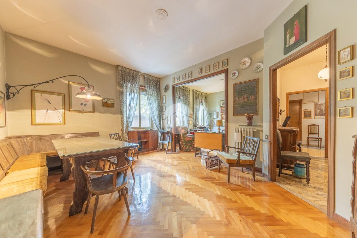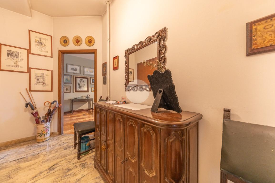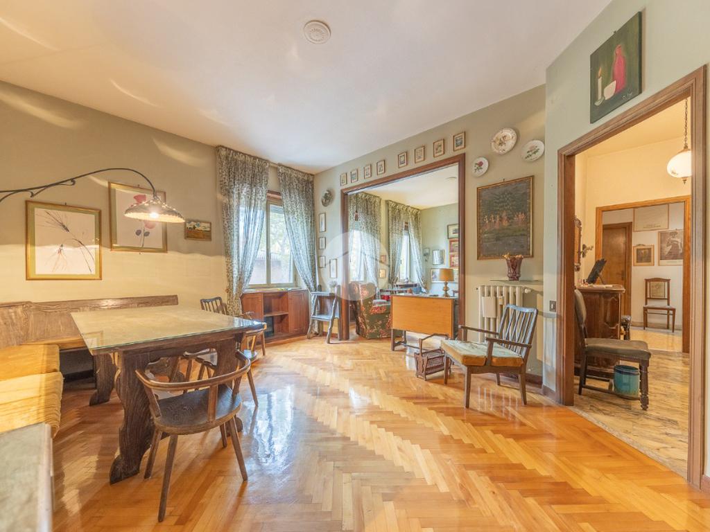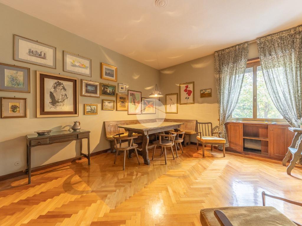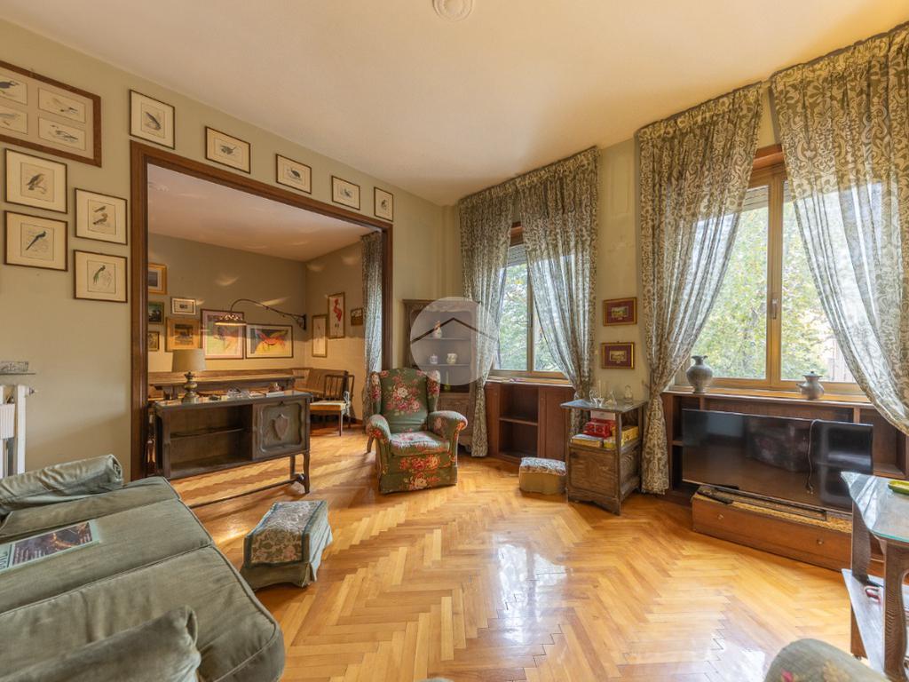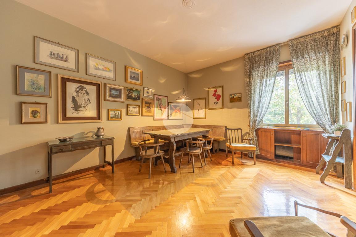 Appena si entra, si viene accolti da un grande disimpegno che introduce all'accesso diretto al salone triplo, ampio e luminoso, da cui si può godere di una bella vista sul parco, regalando un’atmosfera tranquilla e verde.
